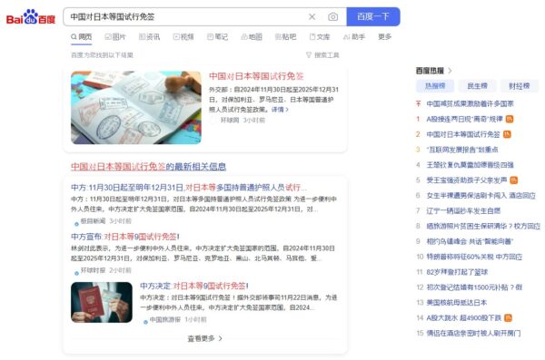 中国人の検索傾向を見て取ることができるGoogleに相当する中国のサーチエンジン、ポータルサイトでもある「百度(Baidu)」でも、日本等へのビザ免除のニュースはホットな検索キーワードとして3番目に登場しています。