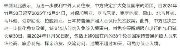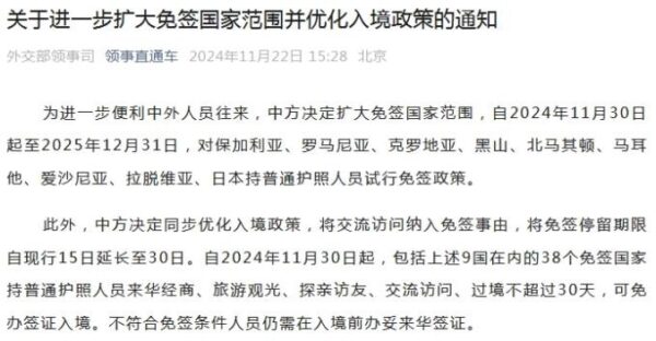 期間は北京時間2024年11月30日から2025年12月31日まで、対象国は、ブルガリア、ルーマニア、クロアチア、モンテネグロ、北マケドニア、マルタ、エストニア、ラトビア、日本。一般旅券(パスポート)を所持する国民がビザ免除試行政策の対象である。