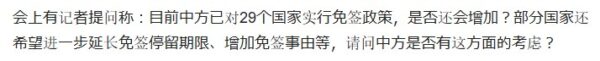 「現在、中国政府は29か国に対してビザ免除政策を展開しているが、対象国を増加する予定はあるか?一部の国からはビザ免除による滞在期間を延長してほしいという要望やビザ免除可能な自由を増やしてほしいという要望がある。そこで尋ねるが、これらに対してどのような見解か?」