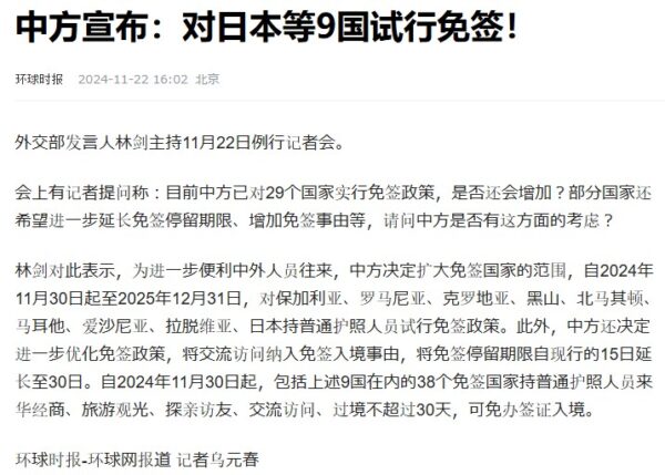 目的は、中国と海外各国との人員の往来を一層活発にするためと触れています。ビザ免除対象国に日本が含まれました。