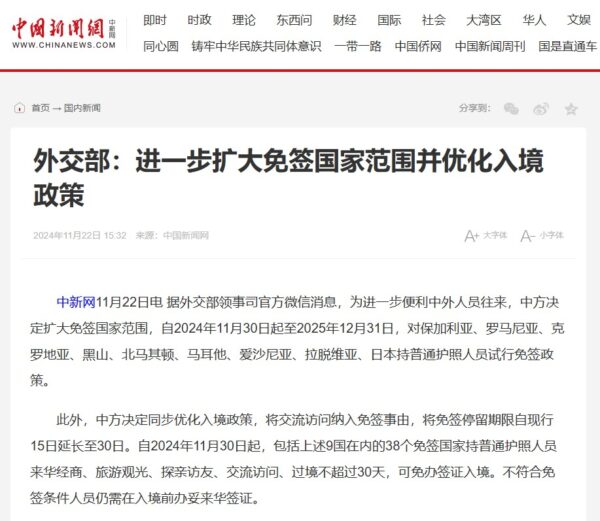 2024年11月30日から、上記9か国を含めた38ヶ国のビザ免除対象国の一般旅券所持者は、中国へのビジネス、観光、親族友人訪問、交流訪問、トランジットを目的であれば、ノービザで30日を超えない範囲で滞在することができる。