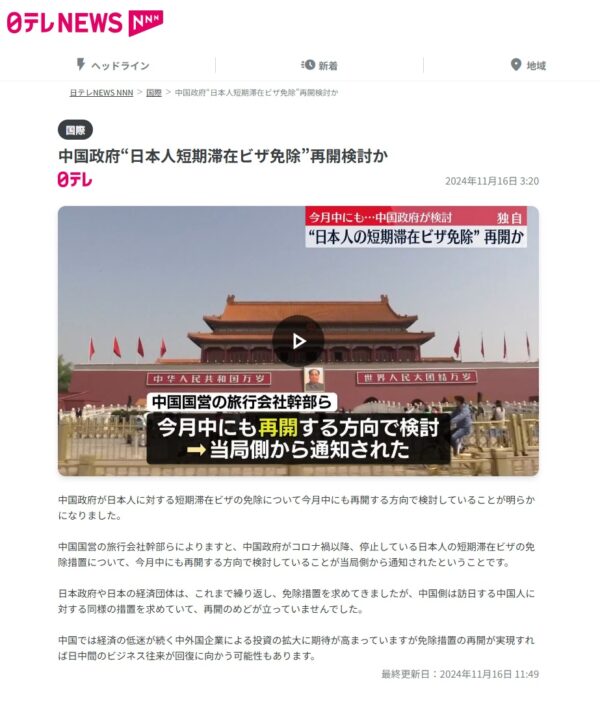 APECの関係で習近平氏が石破総理と会談があるタイミングなのかもしれませんが、韓国に対するの中国ビザ免除に続き、日本に対しても15日以内の短期滞在ビザ免除の検討が始まったと11月16日に各メディアで報道がありました。