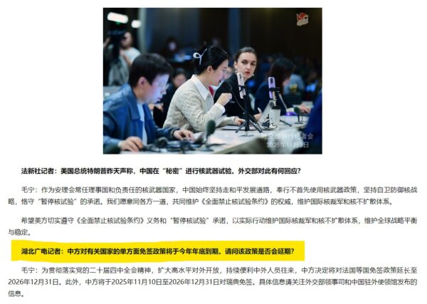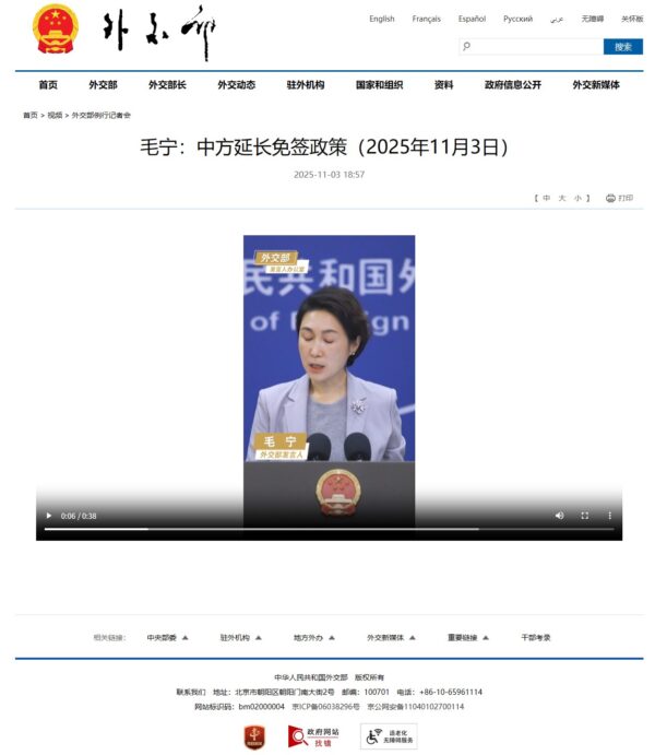中国外交部はこの部分のみ抜き出した38秒間の動画を公開しています。毛宁:中方延长免签政策(2025年11月3日)