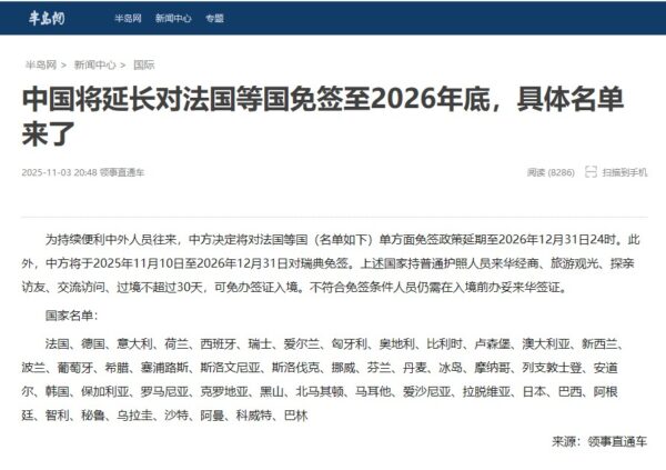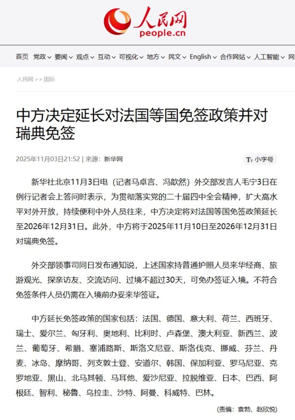 記者会見の概要がWEBにアップされたわずか30分後に、中華人民共和国外交部領事司(中国领事服务网)の公式ページ内の通知でした。発表日時は北京時間2025年11月3日18時10分過ぎでした。