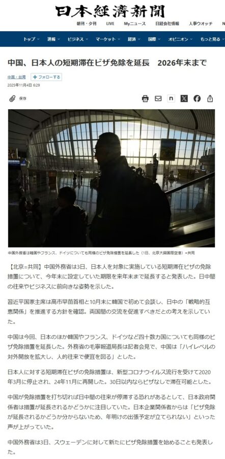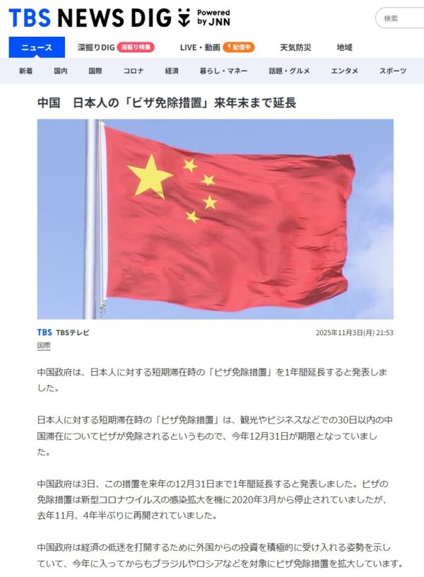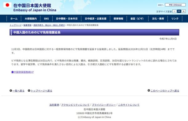 実は、在中国日本国大使館は発表翌日の11月4日付けで、中国政府が日本国民に対する一般旅券保持者のビザ免除措置を2026年12月31日まで延長する旨を掲載しました。