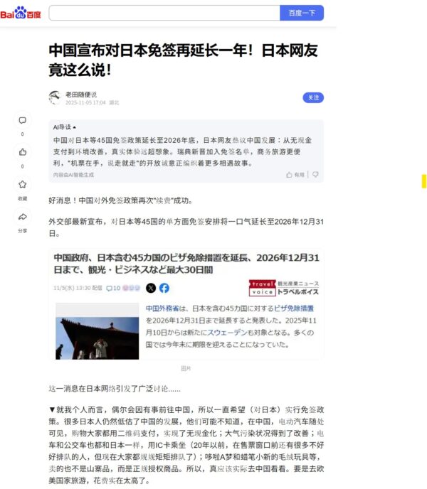 生の声のひとつとして解説します。中国宣布对日本免签再延长一年!日本网友竟这么说!(老田随便说)
