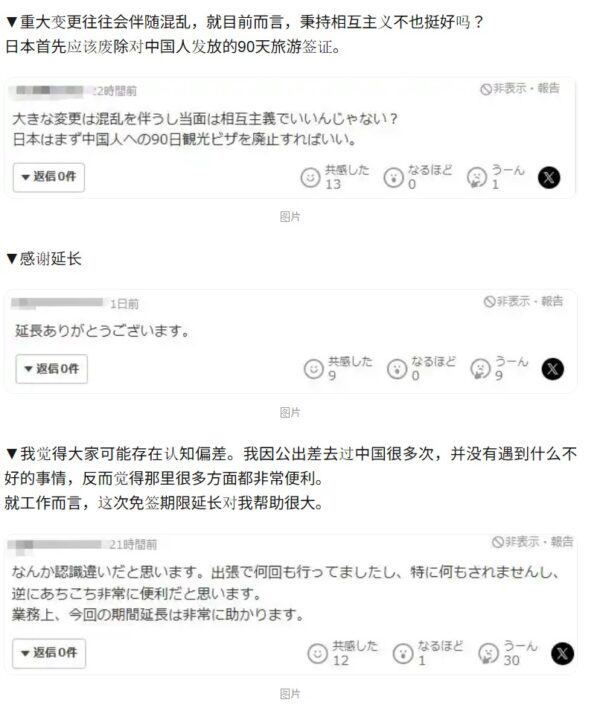 - 本件について全く関心を示さない市民も多いですが、全体として見ればビジネスの往来にとっては非常に便利であり、ビザ免除延長により日中両国の貿易協力はさらに円滑になるでしょう。