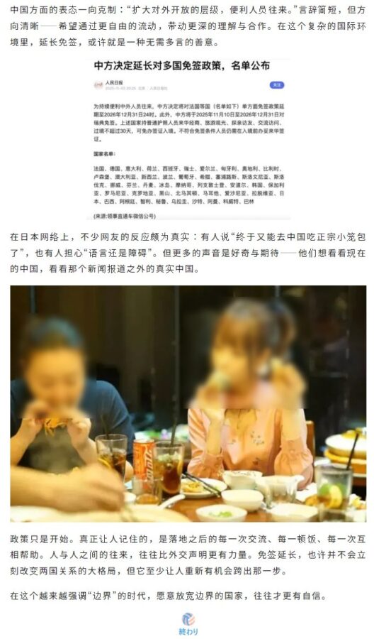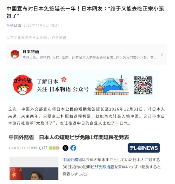 あくまでも日本のことを取り上げているのではなく、中国政府としては、40ヶ国以上もあるビザ免除施策を延長するということ自体を淡々と発表しているだけ、日本を持ち上げるとかいったことは一切ないことに注目すべきだと思います。