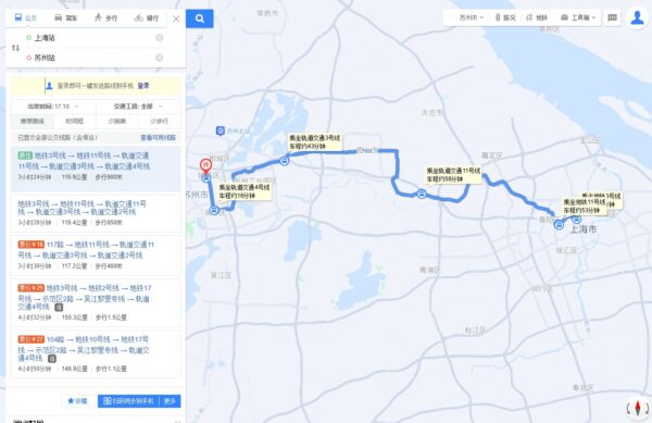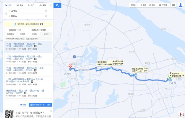上海駅から蘇州駅までタクシーでアクセスする場合、百度地図で検索したところ次の結果が出ました。