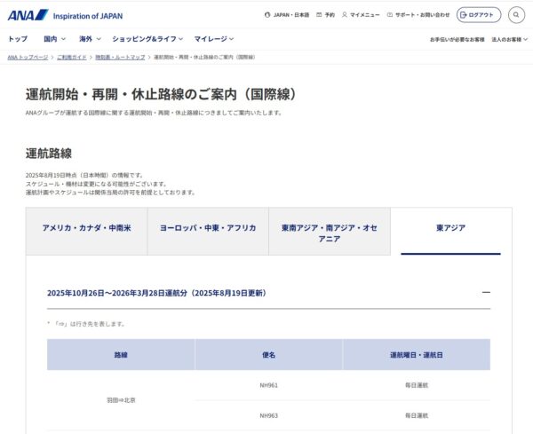 ANA国際線の現時点の運行状況や便名は、運航開始・再開・休止路線のご案内(国際線)をご確認ください。