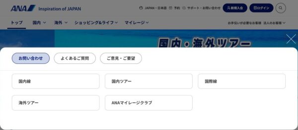 ANAのWEBトッ方法ージの右上に「サポート・問い合わせ」がありますので、それをタップ(クリック)してください。