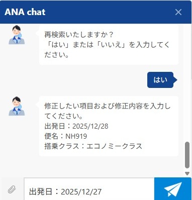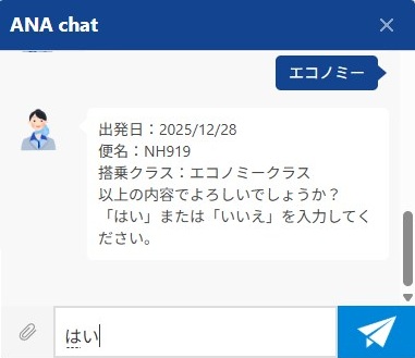 最後に、出発日、便名、搭乗クラスが表示されますので、正しければ「はい」を入力します。異なる場合は「いいえ」と入力してください。
