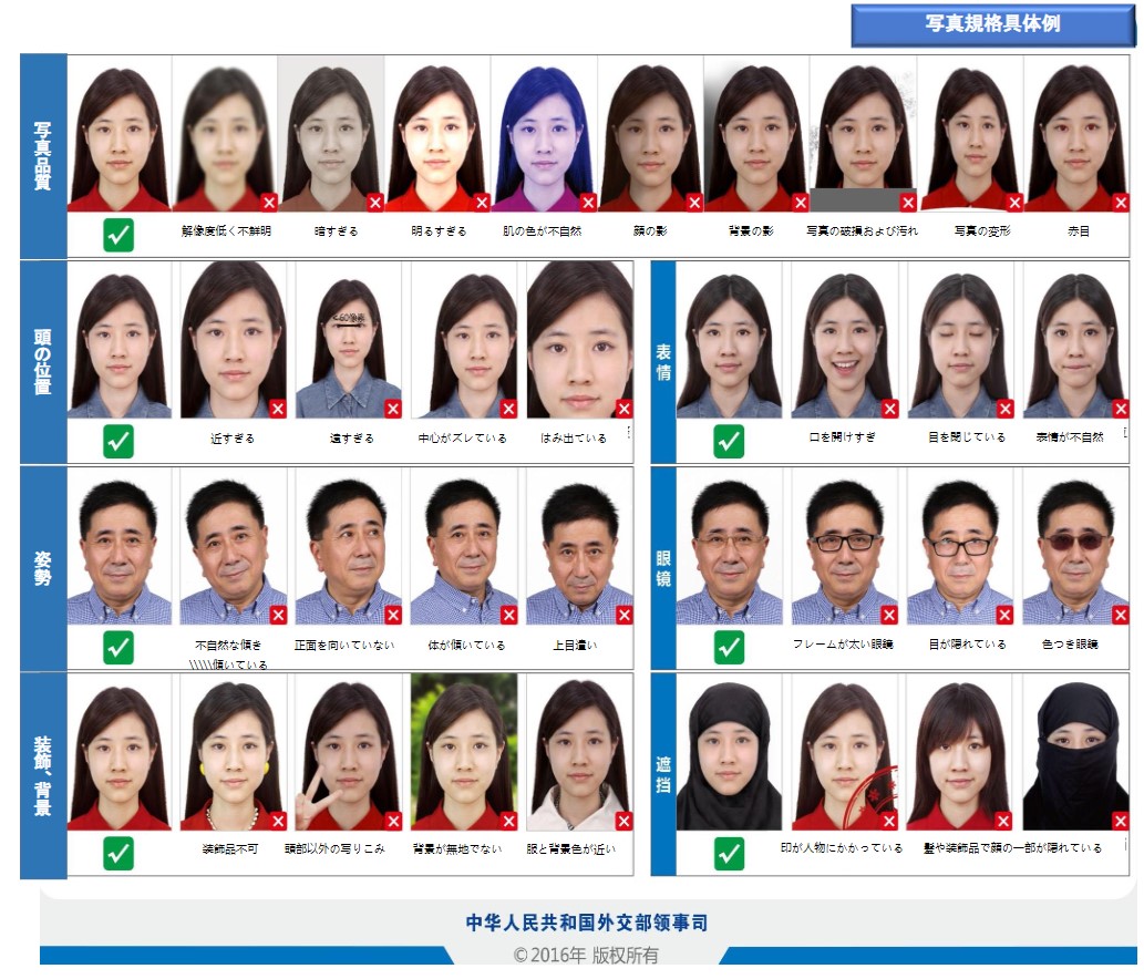 窓口申請時に受け付けられない写真の例がありまして、具体的な禁止事項は次のカテゴリをそれぞれ写真付きで中国当局が示していますので参考にしてください。