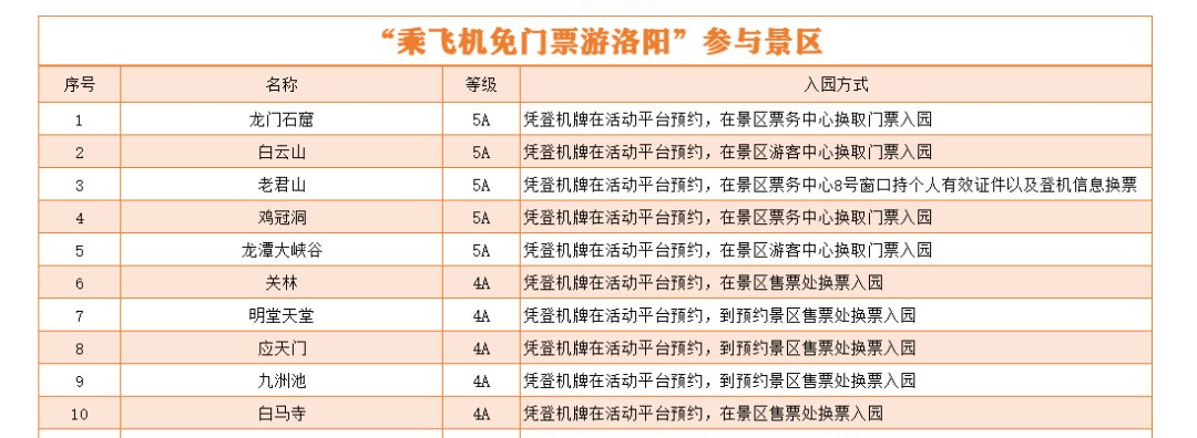 内容 洛陽市内70ヶ所の5A、4Aなど観光地が入場無料