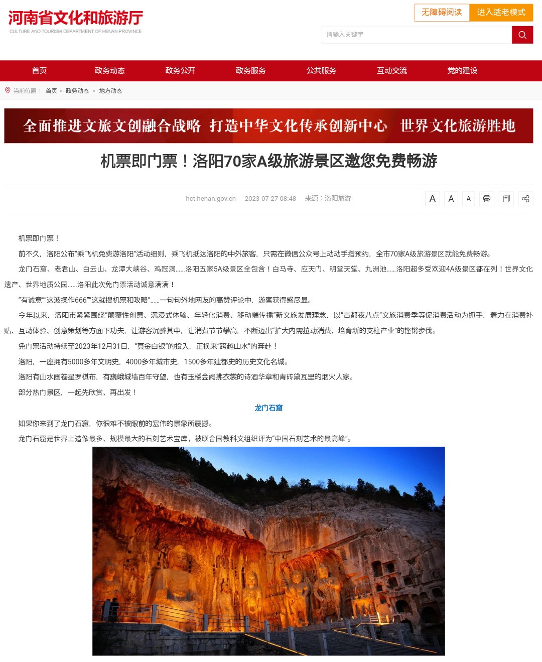 その一例を紹介します。河南省旅遊文化局のサイトからですが、古都で有名な洛陽で、洛陽までの国内線航空券を使用した方向けに市内70ヶ所の観光地の入場料が無料になるチケットを配布するキャンペーンの情報です。
