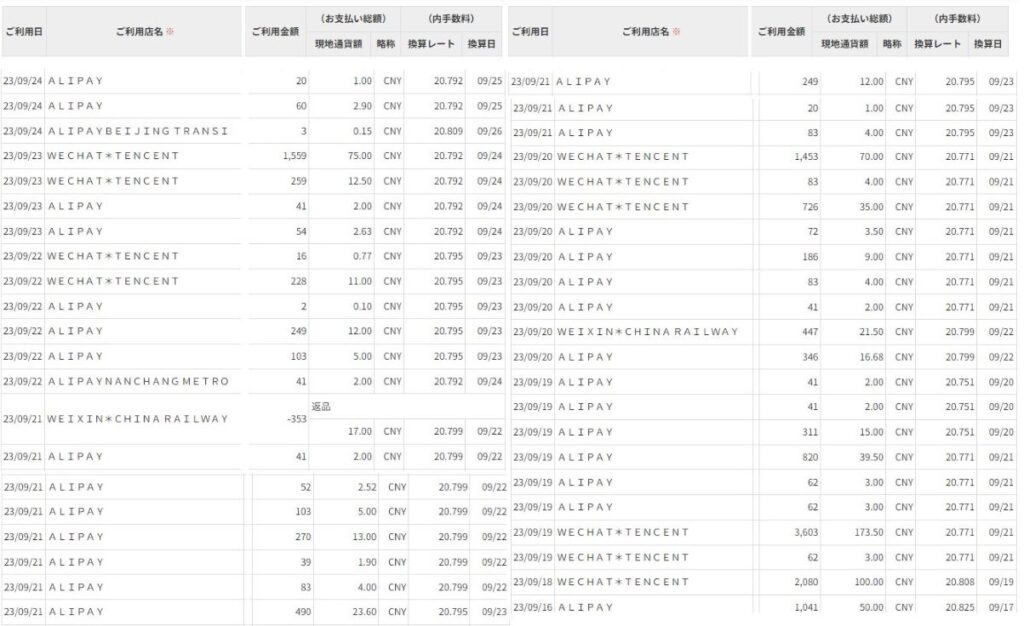 延べ11回決済しました。「WECHATPAY*TENCENT」や「WEIXIN*CHINA RAILWAY」とあるのがWechatPayの決済明細です。一度、鉄道切符購入したのですが、事情が変わって使わなくなったので乗車前に払戻しをしたものが含まれています。