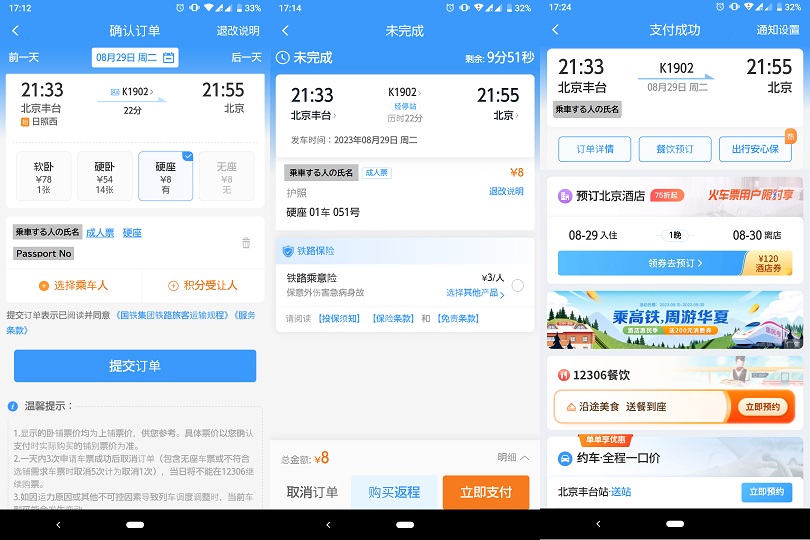画面ですが、乗車する列車や切符の種類を決めて(左側画面)、12306で鉄道切符を確保するために支払ボタンをタップした(真ん中画面)後に、WeChatPayのアプリが起動して、支払い画面が出て、決済ボタンをタップすると完了する流れです。支払成功と表示されています(右側画面)。