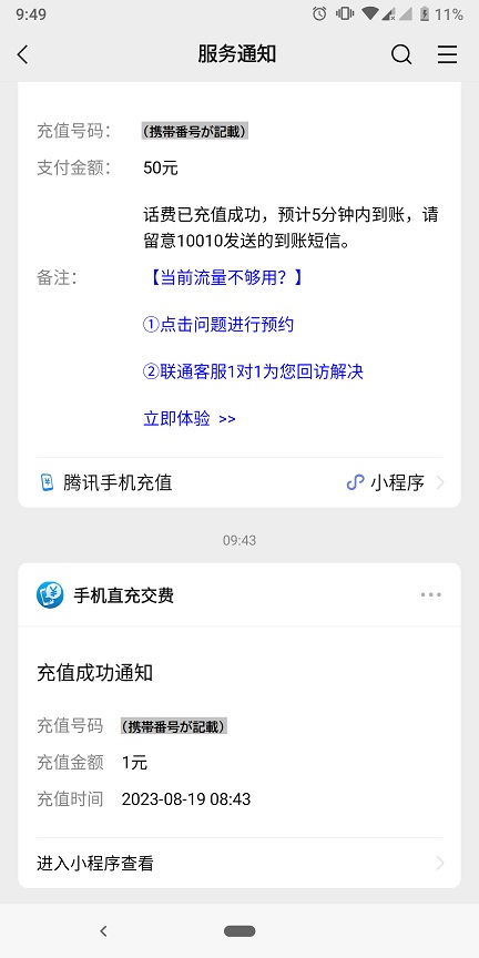 また、別の機会があって、日本でWechatPayのミニアプリで中国で購入したSIMの携帯電話番号の充値(チャージ)をしまして、問題なく決済できました。